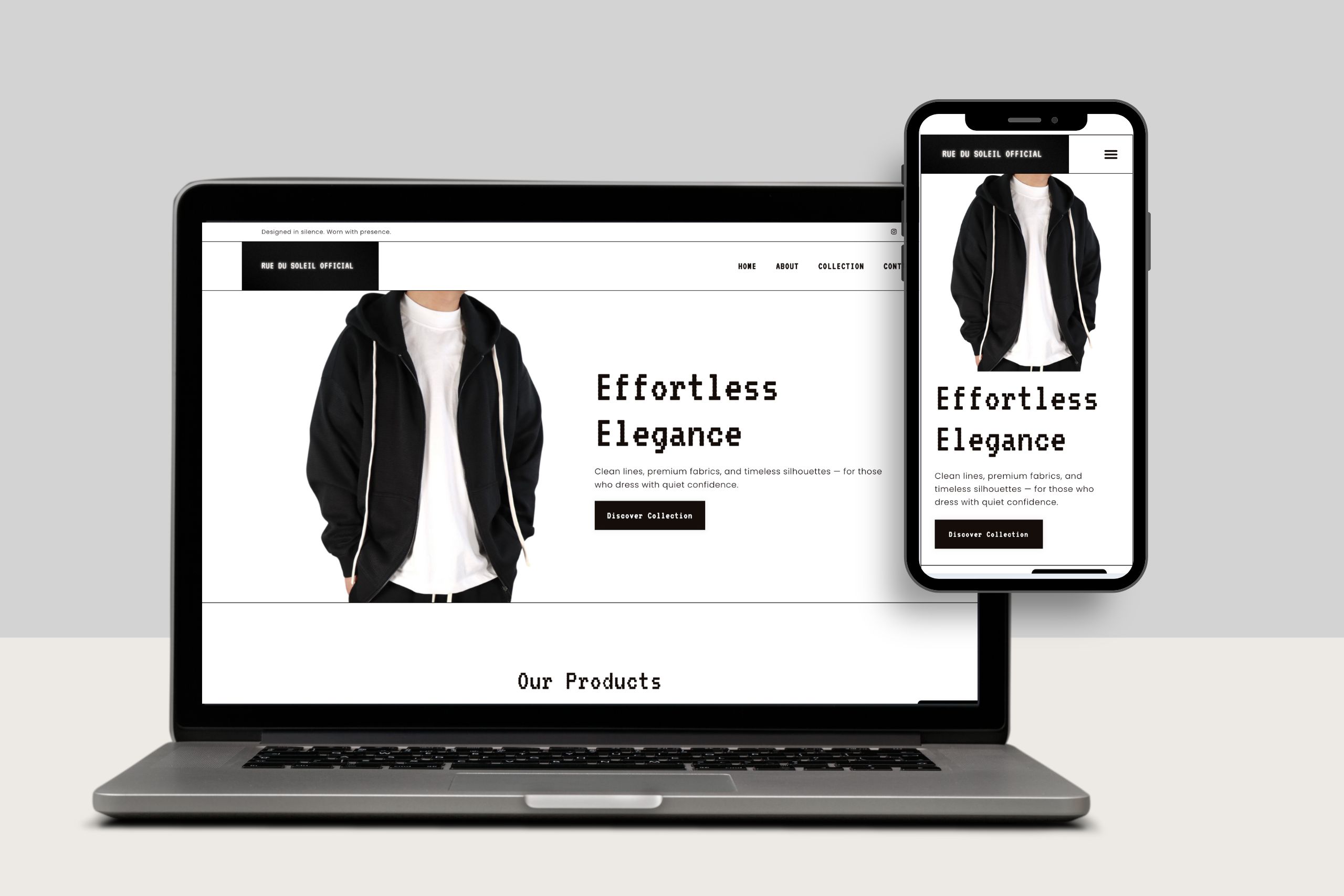 Am realizat designul pentru site-ul RUE DU SOLEIL — o platformă de fashion upscale cu linii curate, materiale premium şi siluete atemporale. Am creat o experienţă elegantă, adaptată mobil, reflectând identitatea brandului şi facilitând navigarea către colecţii.